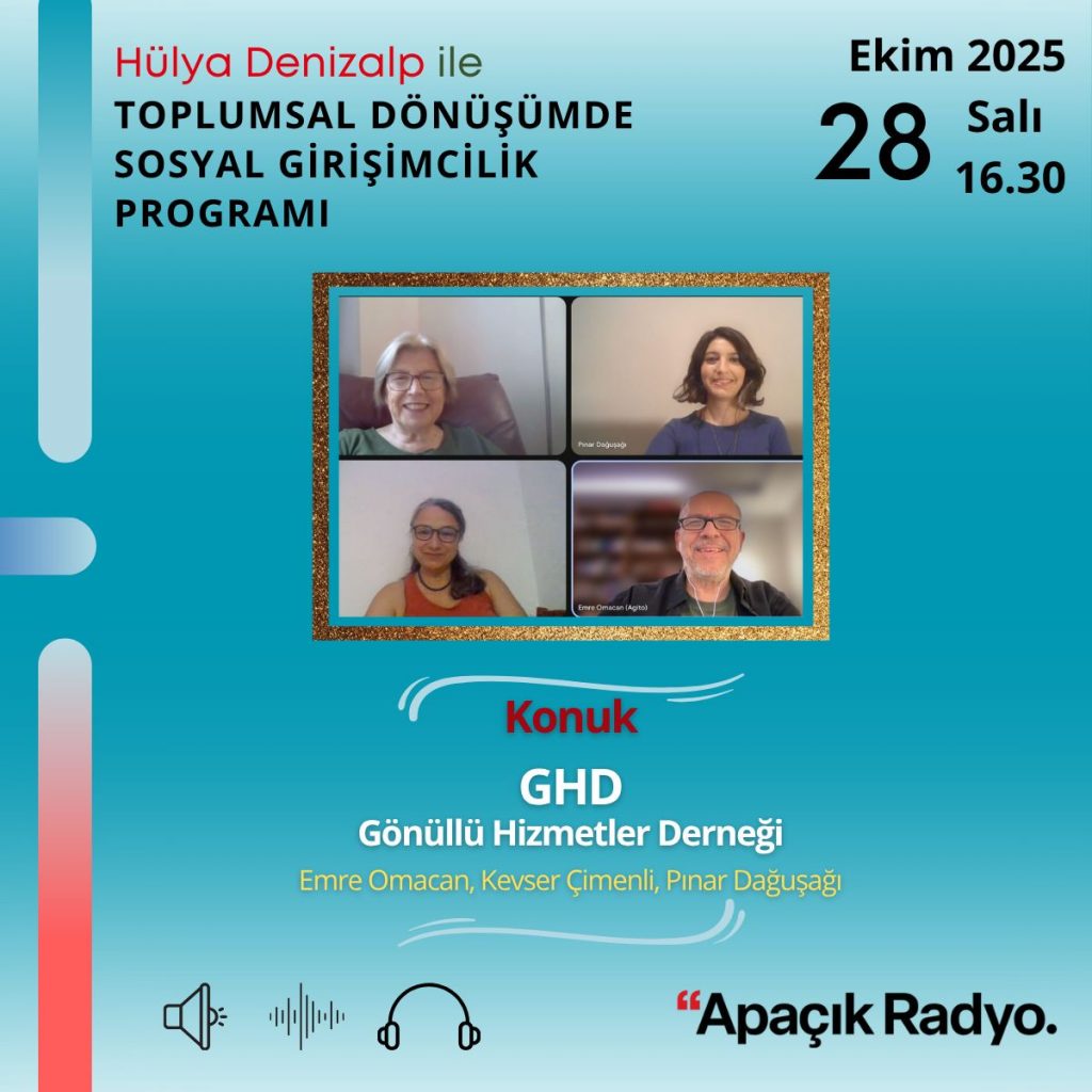 28 Ekim 2025 Salı, bugün saat 16.30 da Türkiye’nin en eski sosyal işletmelerinden GHD’nin ( Gönüllü Hizmetler Derneği) Yönetim Kurulu üyeleri Kevser Çimenli, Emre Omacan ve Genel Koordinatör Pınar Dağuşağı Apaçık Radyo Toplumsal Dönüşümde Sosyal Girişimcilik programında Hülya Denizalp’ın konuğu oluyor.